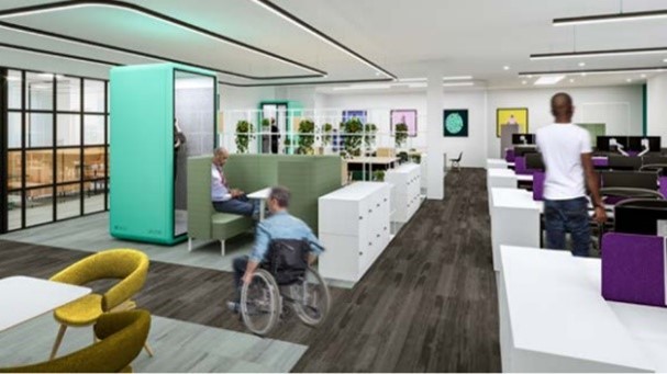 It will be a modern and innovative space, offering varied work settings so you can choose what space you work in based on what you need to get done, whether that's an informal catchup with your team, a hybrid meeting, or a confidential space for a 121.