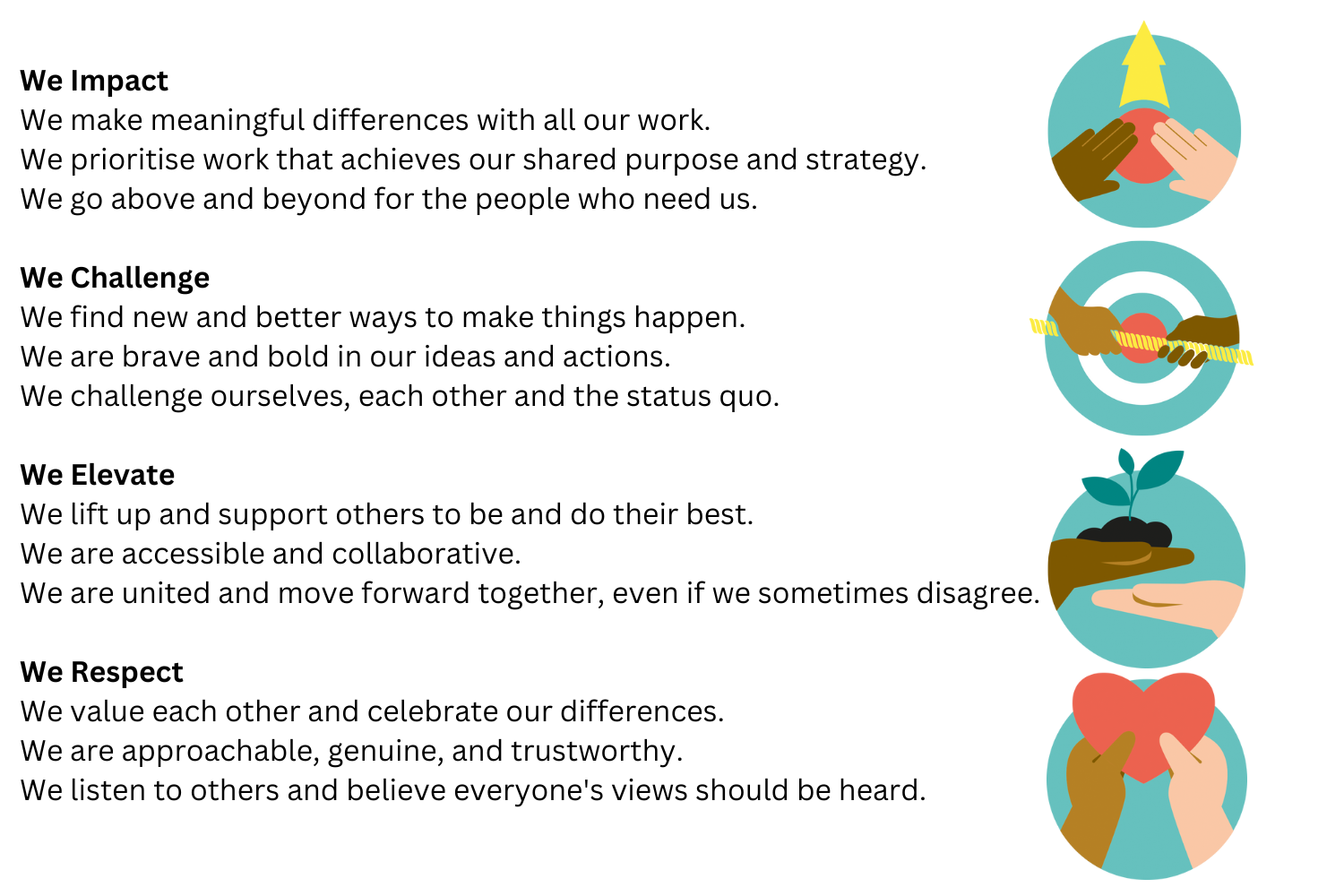 Our values describe what matters to us and inform how we act and make decisions as individuals and as a team. And they drive us in our approach to achieving our vision and purpose.