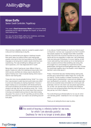 Creating barrier free opportunities for everyone to reach their potential.In July 2016 we launched Ability@Page to demonstrate our commitment to disability and removing all barriers: physical, technological and attitudinal. It allows us to effectively communicate with all employees, clients and candidates so that necessary adjustments can be made for anyone with a disability. Hidden Talent campaign to ensure PageGroup is seen as Employer of Choice for disabled candidatesSignatory of Time To Change pledge – to end mental health discriminationHave a network of Mental Health Champions Healthcare Experience Days – free events open to employees to promote well-being Run annual global Ability@Page campaigns for World Mental Health Day Support and engage in Time To Talk Day, Mental Health Awareness Week Real people/real stories of employees whose lives are affected by disability EAP and private healthcare support Testimonial: Kiran Daffu Diversity, Equity & InclusionLinksOur diversity, equity and inclusion promiseAttracting a more diverse candidate poolOur Diversity StrandsAwards & recognitionPartnershipsDiversity & Inclusion Centre