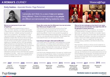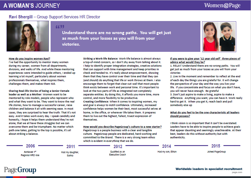 Driving gender equality and fair opportunities for all.In 2012 we launched Women@Page to improve our gender balance at all levels across our business. Since then, we have: Achieved the Times Top 50 Employers for Women 2018 and 2020 Received BITC Gold Award – Gender Benchmark 2018 A global mentoring programme (over 140 women currently taking part in the UK) Women@Page global minisite Senior female leadership programme – Authentic Charisma with Nikki Owen and regular focus groups Partnered with Peppy Menopause Partnered with Smart Works Regularly profile our Women globally Signed the ‘Voluntary Code of Conduct for Executive Search Firms’ Women@Page profiles: Emily and Ravi Diversity, Equity & InclusionLinksOur diversity, equity and inclusion promiseAttracting a more diverse candidate poolOur Diversity StrandsAwards & recognitionPartnershipsDiversity & Inclusion Centre